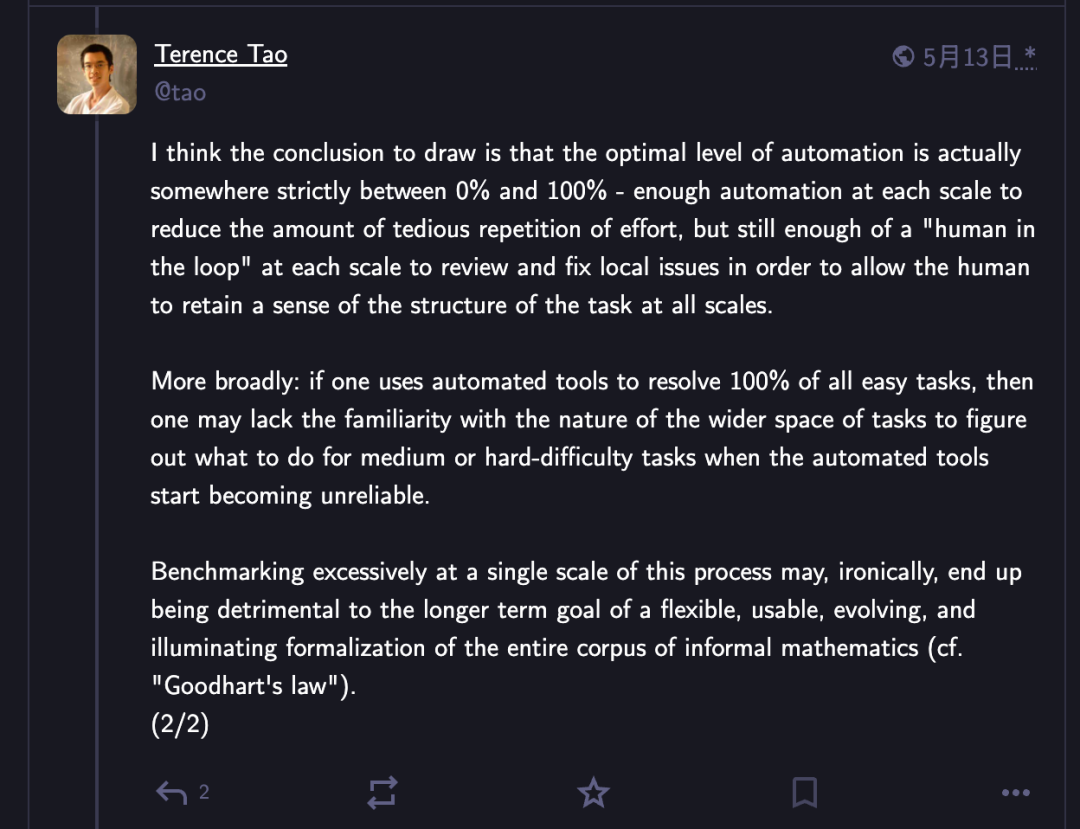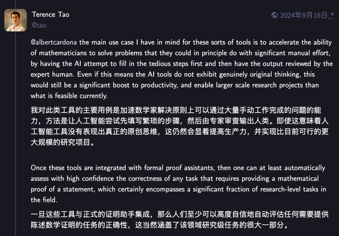 正如他一直所说的那样,AI正在重塑人类科学范式,其最合理的角色是成为数学家的“副驾驶”或助理,而不是取代人类在创造性、直觉性、策略性上的工作。