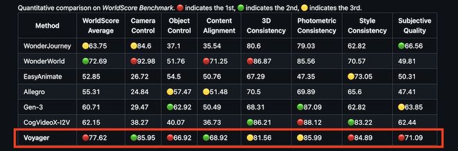 根据斯坦福李飞飞团队主导的WorldScore排行榜,Voyager在当前主流世界模型中平均成绩位列第一。