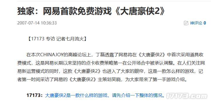 2007年,丁磊更是公开透露,这款“《大唐豪侠2》”将成为网易首款免费游戏。