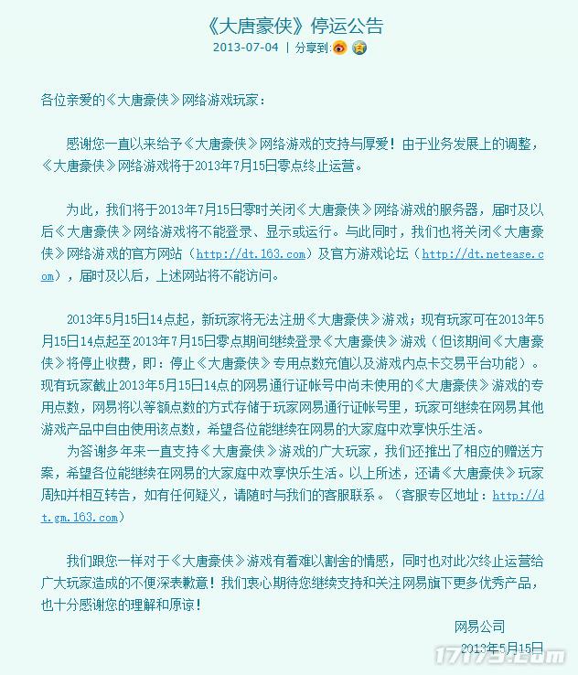 2013年7月4日,网易在《大唐豪侠》官网发布了停运公告,宣布游戏将于7月15日零点正式终止运营。公告仅以一句“由于业务发展上的调整”作为理由,为这款运营了七年的作品画上了句号。