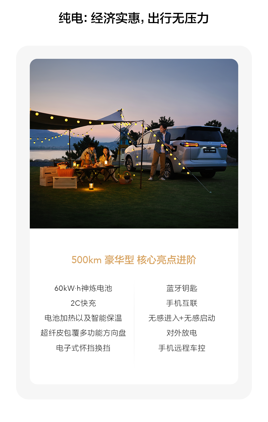 星光 730 纯电 500km 豪华型配备 60kW・h 神炼电池,CLTC 续航 500km,电耗仅 13.6kW・h / 100km,每公里成本仅 7 分钱,且支持 2C 快充。同时,新车还支持 220V 外放电功能。
