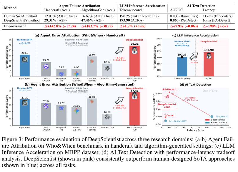 它是第一个能用一个闭环、迭代的流程,发现超越人类最先进方法的自动化科研系统。它的探索不是瞎蒙,而是有目标、有洞察的。它会先去分析现有的人类SOTA方法到底有什么公认的短板,然后通过故障归因来确保自己提出的新想法既新颖,又有科学意义。