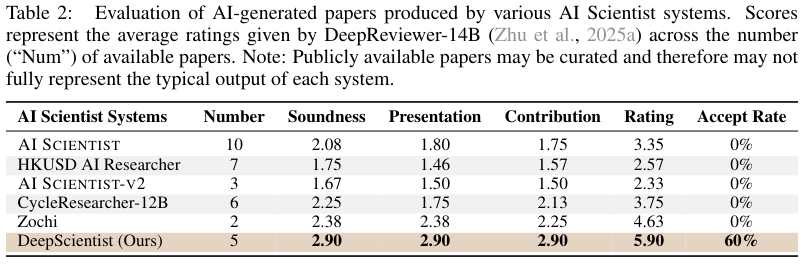 结果,DeepScientist是唯一一个论文接受率达到60%的AI系统。