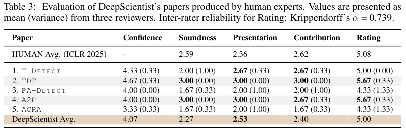 DeepScientist自己写了5篇论文。为了评估这些论文的质量,研究团队搞了个“双重评审”。