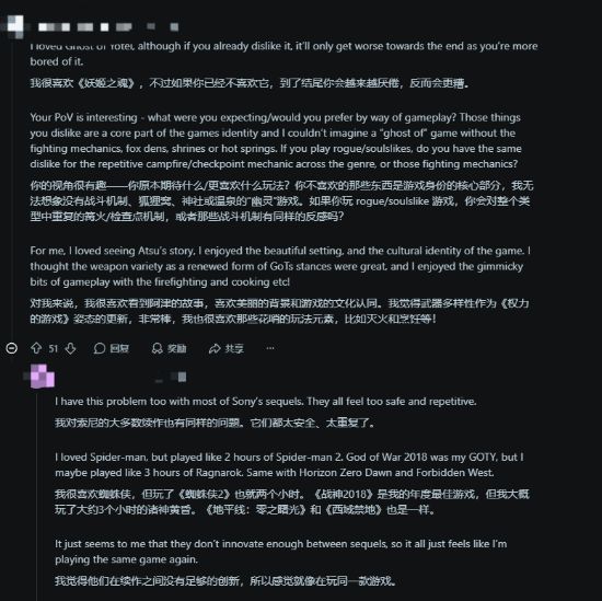 同样,也有玩家表示,索尼的大多数续作游戏都有些太保守,并且同质化严重让人坚持不下去,续作和前作间还是需要有明显创新的。
