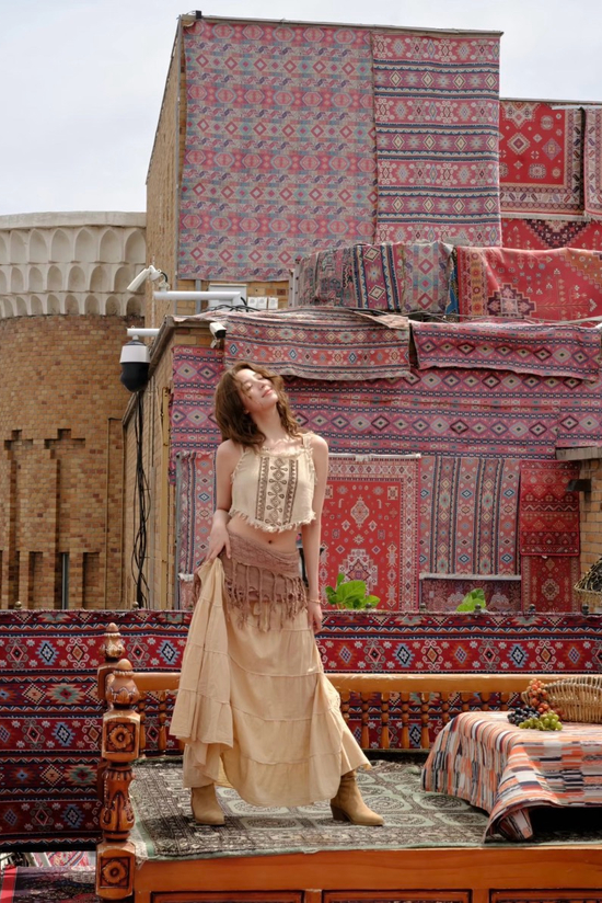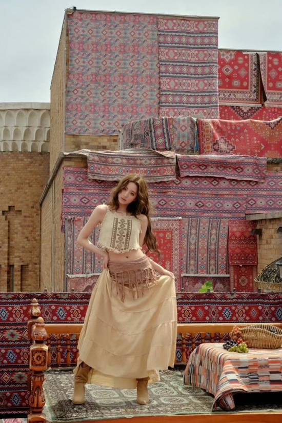 欧阳娣娣褶皱短靴选择了低饱和度的奶茶色,视觉上能减轻靴子的厚重感,搭配波西米亚风长裙透出满满的“元气少女感”。