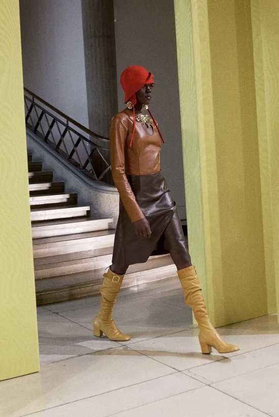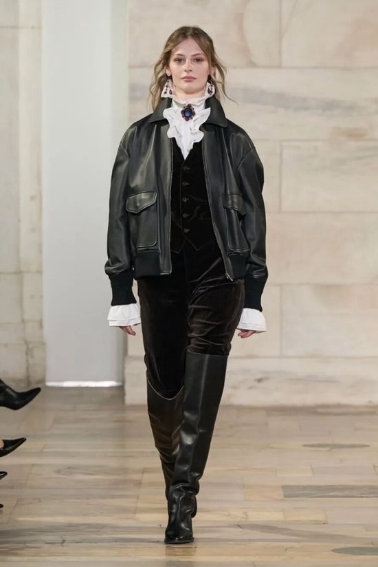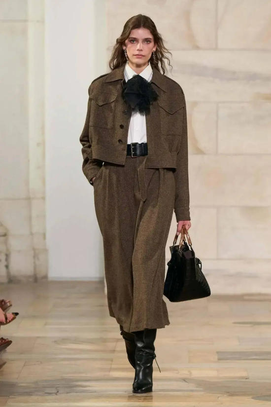 Ralph Lauren 2025秋冬秀场上从外套到包包再到靴子,全是柔软的皮质材质,褶皱靴的靴筒褶皱在灯光下泛着细腻的光泽,搭配同色系的大衣,整个人都透着高级的温柔感。