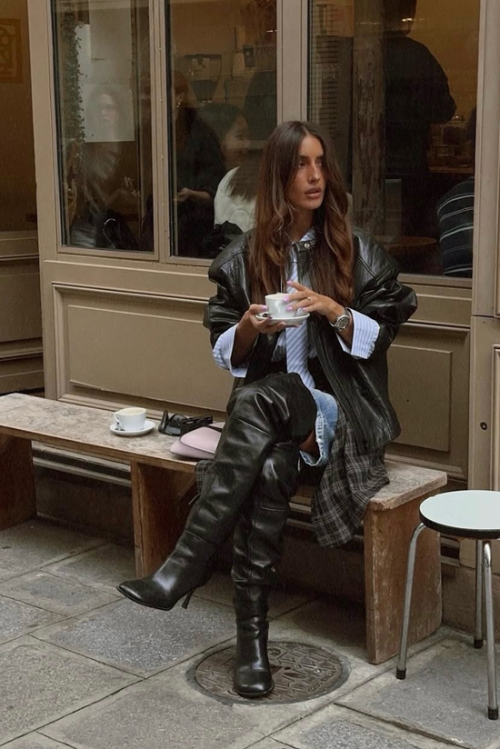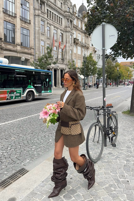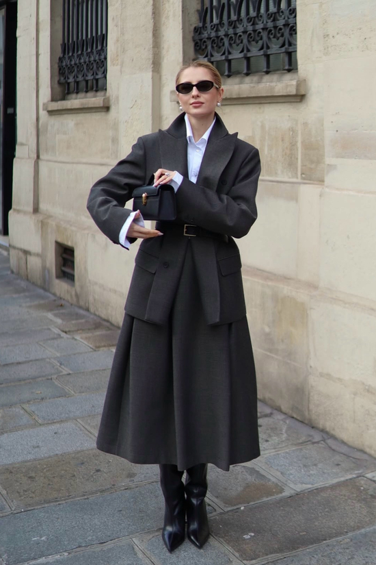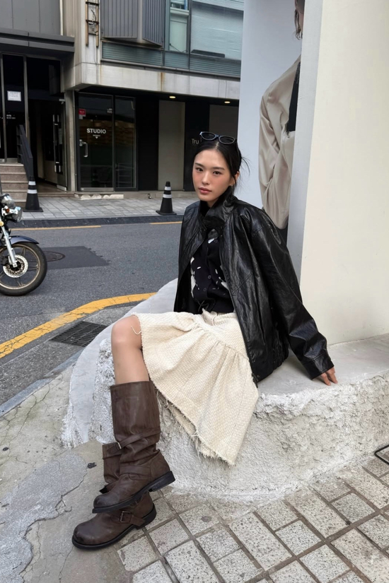 半身裙和褶皱长靴搭配具备超强的兼容性,可以利用挺括的西装搭出通勤的装扮,也可以搭配帅气的皮衣轻松营造甜辣风格。