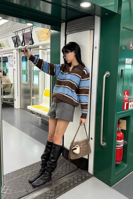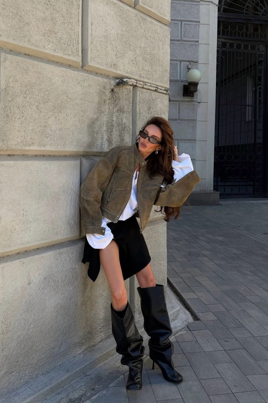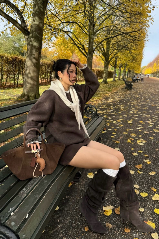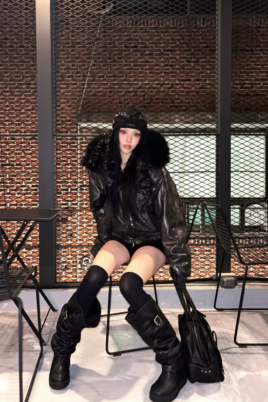 短裙或者短裤搭配褶皱长靴,适当的露肤度可以在视觉上拉长整体比例,宽松款靴筒还能遮住小腿的肉肉,美化腿部线条。