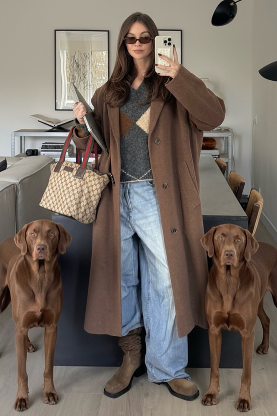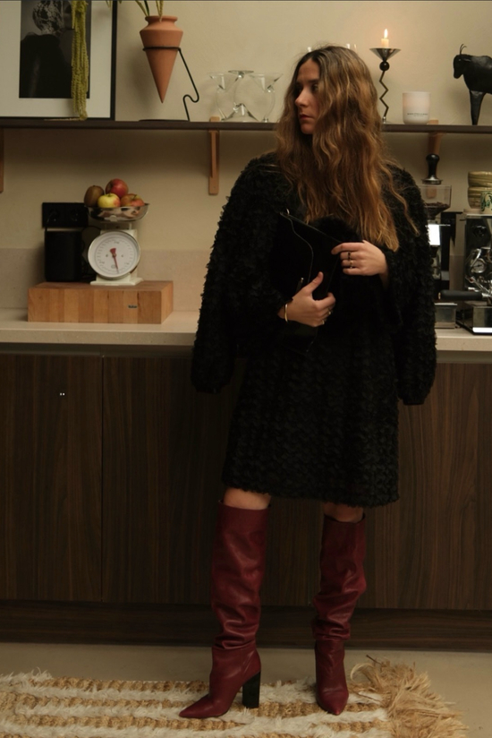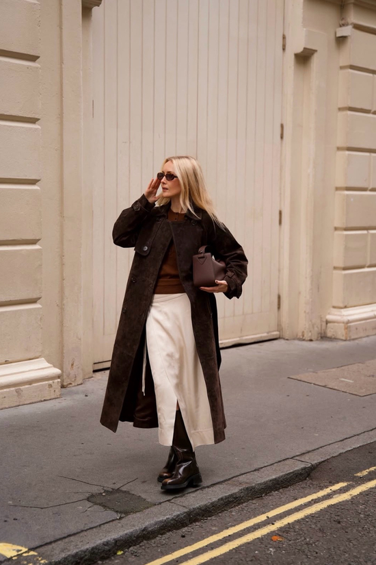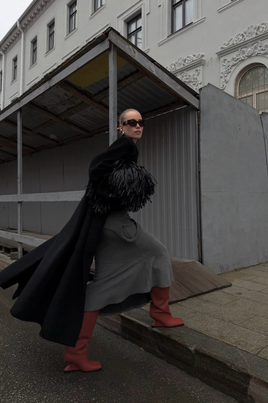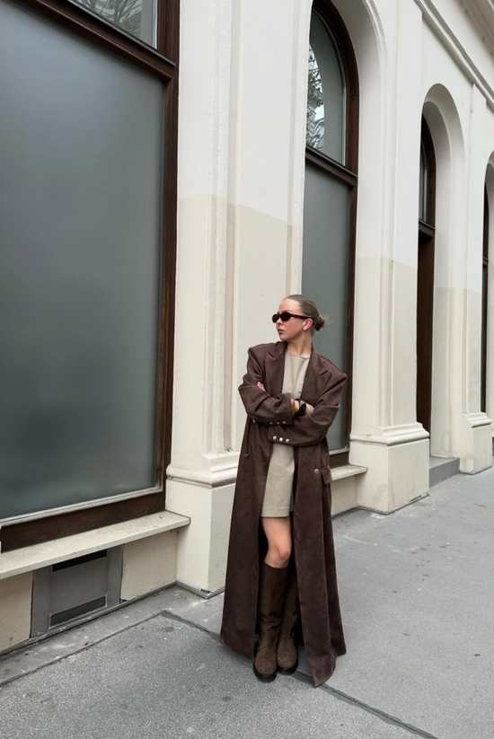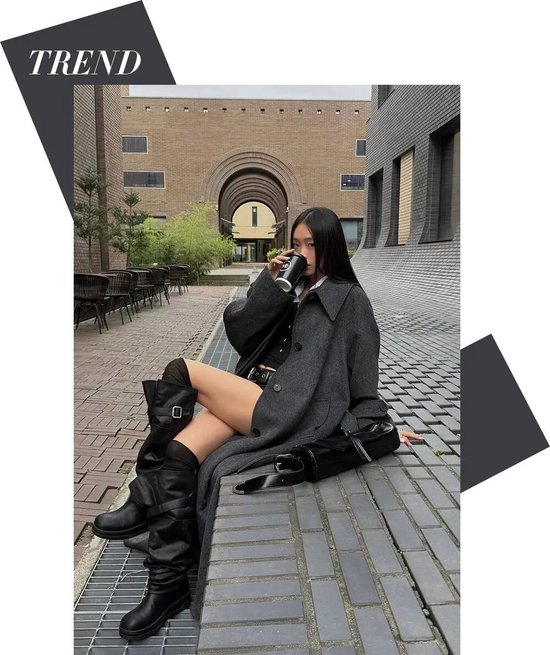 长款大衣同时也是褶皱长靴的百搭模板,廓形oversize外套的利落搭配褶皱靴的慵懒,松弛的时髦感立刻就有了。