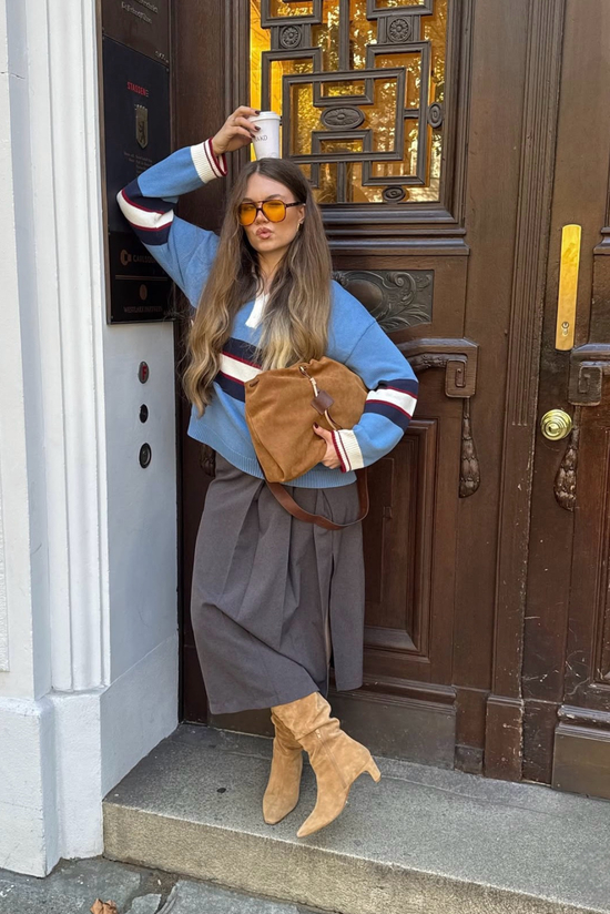 考虑到秋冬季节的穿搭需求,褶皱靴穿搭还有保暖性功能。通过搭配长裤,收紧的靴口锁住暖意,再加上毛衣等基础单品打造保暖时髦的造型。