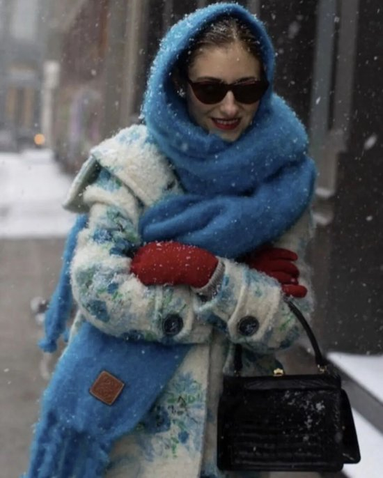 电蓝色和湖水蓝则完全不同,它们更冷、更干净、更科技感,是一种“不想被冬天拖慢节奏”的宣言。蓝色围巾的出现,会让整个造型的气质瞬间变得锐利:它既适合极简风,也适合职场女性的理性气场。