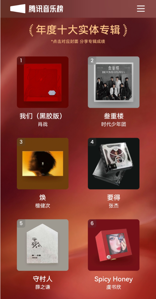 腾讯音乐实体专辑榜以实体唱片销量、关注度等综合数据为依据,呈现华语音乐实体发行市场的真实热度。从全年发布情况看,肖战《我们(黑胶版)》、时代少年团《叁重楼》、檀健次《焕》、张杰《要得》、薛之谦《守村人》均在相应发片期获得不俗市场反响,与虞书欣、白鹿、汪苏泷、十个勤天、张艺兴等歌手及团体的实体作品共同入选年度十大实体专辑。
