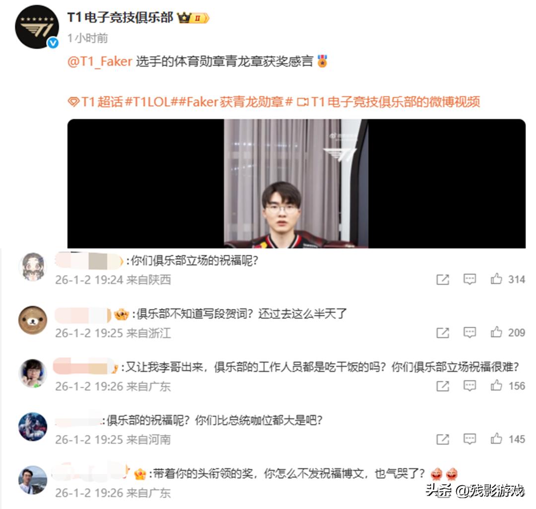 然而在此次报道发出之后,顶着T1头衔领奖的Faker却没有第一时间得到俱乐部的恭贺,这一行为引起了不少Faker粉丝的不满。有粉丝更是翻遍了各大平台T1的官号,发现俱乐部并未参与祝福。在总统艾特,以及节奏变大之后,T1俱乐部也是发布了一条Faker自己的获奖感言,虽说终于是有动静了,但依旧有不少粉丝表示不满,直呼:你们俱乐部立场的祝福呢?俱乐部不知道写段贺词?还过去这么半天了!或许在T1看来,此项荣誉只属于李哥,又或者涉及敏感信息。